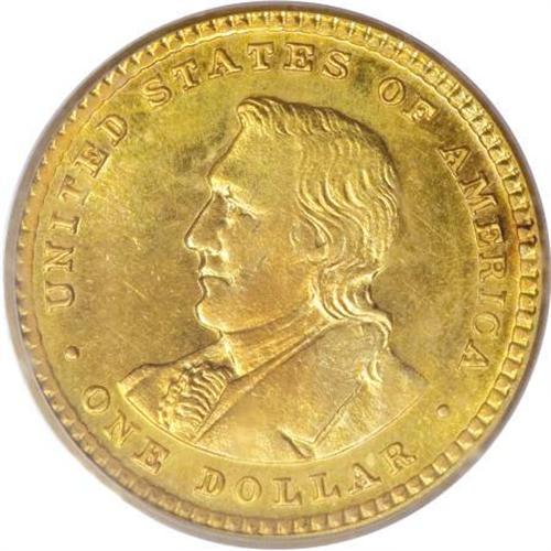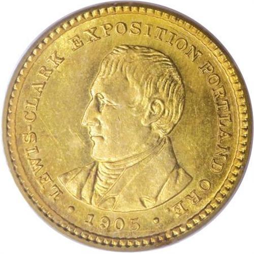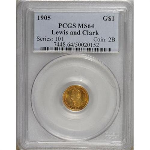 1905 G$1 Lewis and Clark MS64 PCGS. Only about 15% of the original mintage of the Jefferson and McKinley gold dollars of 1903 and 1904 was sold, but the issues were apparently enough of a success that Congress and Treasury officials authorized another pair of gold dollar issues, this time commemorating the Lewis and Clark Expedition of 1804-1806. While the Act of April 13, 1904 authorized a mintage of 250,000 coins, only 25,000 of each date were produced and about 15,000 of each were subsequently melted, for a net mintage of about 10,000 pieces. This 1905-dated piece is lustrous, with light apricot-gold surfaces that show a few faint hairlines in the obverse fields and a single mentionable tick on Clark's cheek.<BR><BR><b>Shipping:</b> Coins & Currency (<a target="_blank" href="http://www.heritageauctions.com/common/shipping.php">view shipping information</a>)