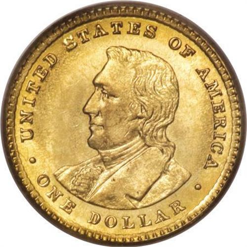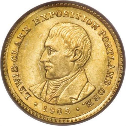 <B>1905 G$1 Lewis and Clark MS64 PCGS.</B></I> The 5 in the date is lightly recut. A rich satiny sheen and delicate amber and lime-gold toning ensure the superior eye appeal of this near-Gem Lewis and Clark gold dollar. An interesting orange-peel texture (as struck) is noted near the peripheral devices on both the right and left sides of the obverse and the reverse. Boldly struck with a few trivial pinscratches and contact marks that prevent a higher grade. <BR><BR><b>Shipping:</b> Coins & Currency (<a target="_blank" href="http://www.heritageauctions.com/common/shipping.php">view shipping information</a>)