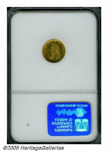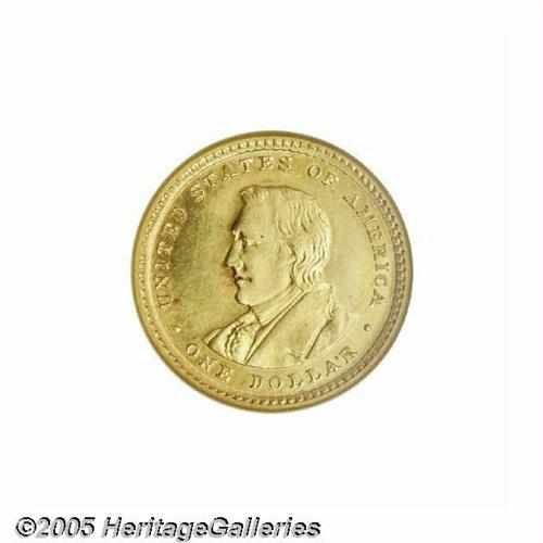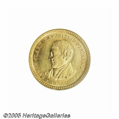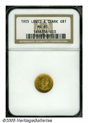 <B>1905<G$1> Lewis and Clark MS65 NGC.</B></I> Always in strong demand and this is one of the scarcer early issues from the Commemorative gold series that is difficult to find in full Gem condition. The strike is sharp, with full details on Lewis and Clark's hair and the only minor weakness seen is on Clark's ear, typical for the issue. Bright yellow-gold in color with a few minor specks of copper toning intermixed. We note a thin line in the lower left obverse field, and this perhaps limited the grade. With the recent 200th anniversary of this famous land transaction passing (2003), we expect these coins to remain very popular with collectors.