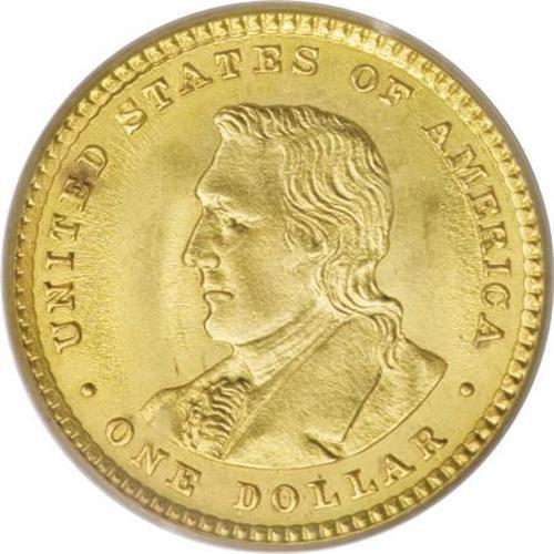<B>1905 G$1 Lewis and Clark MS65 PCGS.</B></I> Assembling a complete set of classic gold commemoratives is a significant undertaking, and while the higher-denomination issues present some of the largest challenges, the gold dollars contain a few elusive issues as well. Q. David Bowers (1991), in his <I>Commemorative Coins of the United States</B></I>, notes that " ... among all commemorative gold coins of this denomination, the Lewis and Clark issues of 1904 and 1905 are singularly distinctive for their rarity in higher grades."<BR> This Gem offers strong, pleasing luster with a measure of roughness evident in the fields. The well struck devices are carefully preserved overall, though a wispy mark is noted in the right obverse field. Aside from a rose-violet alloy spot between the ED of UNITED on the reverse, the surfaces are predominantly pale yellow-gold.<BR><I>From The Fleur Wales-Baillie Collection.</B></I><BR><BR><b>Shipping:</b> Coins & Currency (<a target="_blank" href="http://www.heritageauctions.com/common/shipping.php">view shipping information</a>)