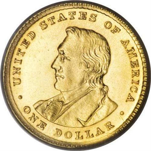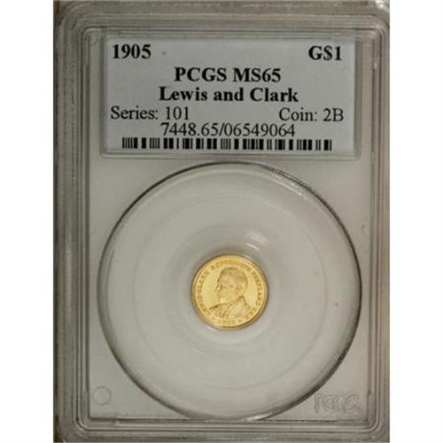 <B>1905 G$1 Lewis and Clark MS65 PCGS.</B></I> The <I>Guide Book</B></I> reports similar mintages for the 1904 and 1905 Lewis and Clark gold dollars. The 1905, however, is noticeably scarcer in MS65 and higher grades. In fact, the 1905 Lewis and Clark is the scarcest commemorative gold dollar in MS65. This is not surprising, because the date is early in the commemorative series, yet closes a three-year run of commemorative issues of the denomination. Many collectors were sated by the two 1903 Louisiana Purchase issues and the 1904 Lewis and Clark dollar, and passed on the 1905 issue. Of the 25,000 pieces struck, more than half were eventually melted as unsold. The present mildly prooflike piece is well struck on the devices, and shows only minor weakness on the left side dentils. A few faint marks on the left portion of the Lewis side are all that preclude an even higher assessment.<BR><BR><b>Shipping:</b> Coins & Currency (<a target="_blank" href="http://www.heritageauctions.com/common/shipping.php">view shipping information</a>)