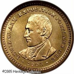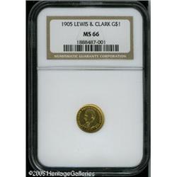 <B>1905 G$1 Lewis and Clark MS66 NGC.</B></I> Significantly scarcer than its 1904 counterpart, only 10,041 pieces were struck and far fewer were preserved in collectible grades by attendees at the exposition in 1904 and 1905. A well balanced coin, this is an especially attractive example that has bright prooflike fields on each side. The surfaces are notably free from abrasions on each side.<BR><I>From The Beverly Hills Collection.</B></I> Lot:8646