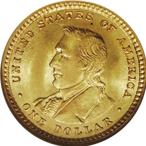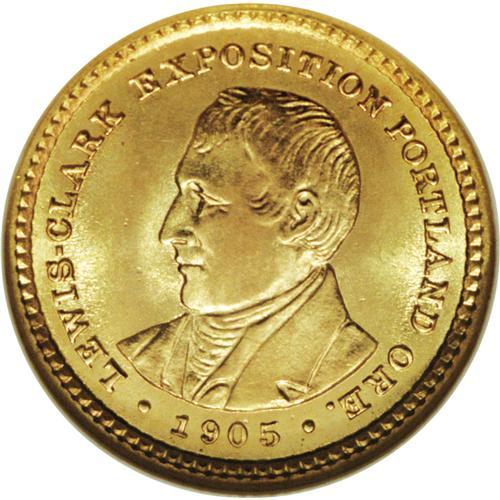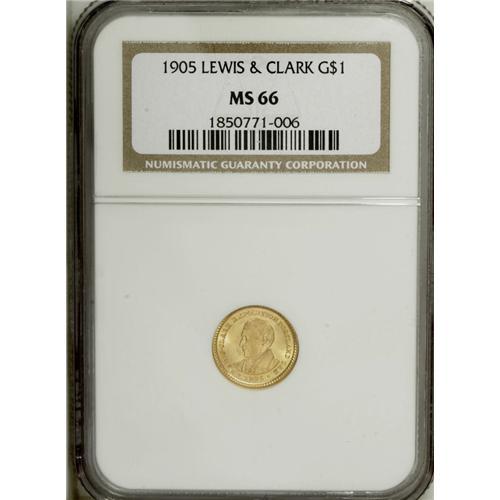 <B>1905 G$1 Lewis and Clark MS66 NGC.</B></I> The large-scale meltings and rapid price depreciation of the Louisiana Purchase gold dollars made collectors wary of the new Lewis and Clark commemoratives, and after the relative failure of the issues of 1904 and 1905, it would be another decade before any commemorative coinage, gold or silver, would be struck in the United States. This example from 1905, generally considered to be the scarcer of the two dates, has highly lustrous yellow-gold surfaces, though without the prooflike surfaces often seen on higher-grade pieces. The portraits have suitable detail, and hardly any marks are visible to the unaided eye. With only two finer examples certified by NGC, it is hard to come across a better example for a high-grade set of commemorative gold (11/06).<BR><I>From The RNB Collection.</B></I><BR><BR><b>Shipping:</b> Coin/Currency (<a target="_blank" href="http://www.heritageauctions.com/common/shipping.php">view shipping information</a>)
