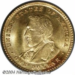 <table><tr><td><table><tr><td>1905 G$1 Lewis and Clark MS66 PCGS. The 1905 Lewis and Clark is widely recognized as the key to the gold commemorative series, and it is significantly scarcer than its 1904 counterpart. Only on rare occasions do we have the opportunity to offer for sale an MS66 example of this important coin. Only 53 pieces have been so graded by PCGS with a mere three finer (3/04). This particular coin has exceptionally attractive mint luster. The colorations it exhibits are also noteworthy, particularly the subtle lilac and orange-gold patina on the reverse that deepens significantly on the lower portion of that side. Exceptional quality and definitely worthy of consideration for the one of the finest sets of commemorative gold coins being assembled today. <BR><BR><B>Important notice:</B> Heritage usually auctions material at the rate of 200-250 lots per hour. On some occasions eBay Live bid software or the Internet may not be able to keep up with the pace of the auction. We recommend placing a realistic absentee bid now as insurance to avoid disappointment. Occasionally the auctioneer may eliminate or reject an eBay Live bid, and the auctioneer may also reopen a lot after the close of the eBay live bidding (usually because we missed an audience bid), and may reject your bid even if it shows you as the winning bidder. By bidding via eBay Live, you agree that Heritage may award the lot to another bidder at its sole discretion under the circumstances described above or any other reasonable circumstances. Since eBay bids are not shown to us until we open the lot on the floor, we treat those bids just like floor bids. In most cases the floor responds before the eBay bid is presented to us, due to Internet lag time, so for consistency we have made it a policy that floor bids are always considered first over tie eBay live bids. Also please note that all Heritage lots purchased through eBay Live carry a 20% Buyer's Premium. Please make sure you read the Terms and Conditions before you bid. <BR><BR><B>IMPORTANT ANNOUNCEMENT ABOUT RESERVES:</B> Heritage now divulges all reserves on its web site 7 days before every auction. If you want to know whether the reserve on this lot has been met, and if not, what the reserve amount is, please visit this lot page on the HeritageCoin.com web site, or email: bid@HeritageGalleries.com </span></font></td></tr></table></td></tr></table>