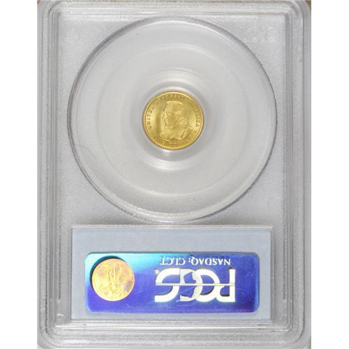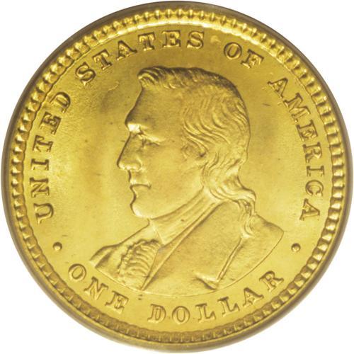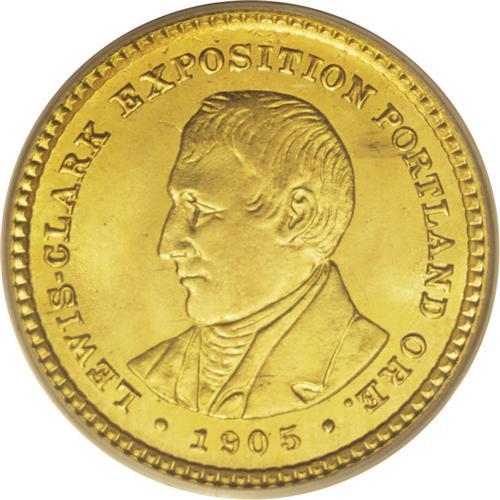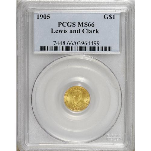 <B>1905 G$1 Lewis and Clark MS66 PCGS.</B></I> While the poor sales of the 1904 Lewis and Clark dollars did not inspire much confidence, this did not stop Farran Zerbe from commissioning a batch of differently-dated dollars to hawk to fairgoers and budding speculators. The former continued their indifference and the latter were wary of yet another commemorative issue that threatened to plunge in value, and so most potential customers thought twice before ordering. The ensuing disaster led to a decade-long hiatus in commemorative coinage.<BR> Many fairgoers who acquired examples cleaned, mishandled, or otherwise lessened their numismatic value, and nearly pristine representatives are elusive and desirable. The shining surfaces of this Premium Gem are primarily canary-gold with a hint of green on the obverse. Each portrait has unusually clear details, and neither side has any offensive marks. With just two finer examples graded by PCGS, it is supremely difficult to acquire anything better (3/07).<BR><BR><b>Shipping:</b> Coins & Currency (<a target="_blank" href="http://www.heritageauctions.com/common/shipping.php">view shipping information</a>)