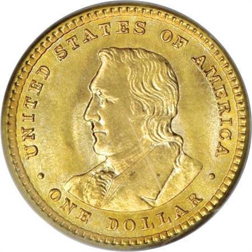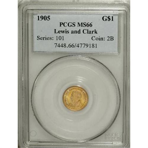 <B>1905 G$1 Lewis and Clark MS66 PCGS.</B></I> The existence of most of the Lewis and Clark dollars struck was short. Struck in Philadelphia in 1904 and 1905, the pieces made their way to Portland, Oregon, where Farran Zerbe offered them through a mail-order agent and local concessionaires. Later, certain examples traveled with him to other, smaller exhibitions. The 1904-dated pieces that went unsold were melted at the San Francisco Mint, while the vast majority of the 1905 examples never left Philadelphia.<BR> This Premium Gem representative of the latter issue did not merely escape the melting pot; its preservation suggests a charmed life spanning more than a century. The fields, yellow-gold with peach and orange accents, offer strong, swirling luster, and the strike is solid. Beautifully preserved with exquisite visual appeal. PCGS has graded a mere two finer pieces (10/07).<BR><I>From The Fleur Wales-Baillie Collection, benefiting the Khumbula Thina Trust.</B></I><BR><BR><b>Shipping:</b> Coins & Currency (<a target="_blank" href="http://www.heritageauctions.com/common/shipping.php">view shipping information</a>)