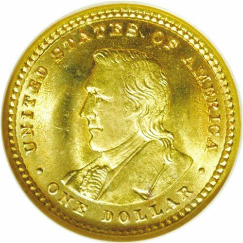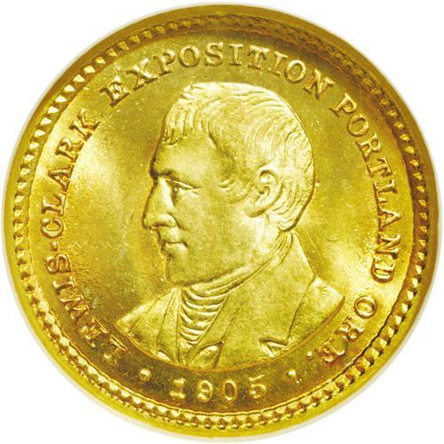 <B>1905<G$1> Lewis and Clark MS67 NGC.</B></I> Ex: Swiss America/Dr. Merritt. Fully struck with scintillating cartwheel luster in the fields and exquisitely beautiful red-orange and mint-green toning presented over both sides. As expected, the surfaces of this stunning Superb Gem are virtually pristine.<BR> Although the U.S. commemorative series was little more than a decade old by 1905, history was already repeating itself. The 1893 Chicago World's Fair was originally set to open in 1892, a more logical date since it commemorated the 400th anniversary of Columbus' discovery of America. From a numismatic perspective, the solution was to strike Columbian half dollars for both dates, 1892 and 1893, thus creating an additional coin for the collector to acquire, and additional revenue for the Exposition organizers. The Portland, Oregon Lewis and Clark Exposition was originally scheduled to open in 1904, but did not do so until June, 1905, partly due to competition from the 1904 Louisiana Purchase Exposition in St. Louis. Once again, the numismatic solution was to strike Lewis and Clark gold dollars with both dates. The 1904 and 1905 issues have similar net mintages, per the <I>Guide Book,</B></I> but it is clear that the 1905 is the scarcer of the two dates in better Mint State grades. The temptation is to conclude that collectors who purchased the 1904 passed on the 1905, but in fact, neither date was made available until 1905. More likely, the Philadelphia Mint produced and delivered the 1904 gold dollars with better quality, relative to the 1905 issue. Currently, the Lewis and Clark is the only two-headed U.S. type, although that is likely to change with the upcoming Presidential/First Lady commemorative series. Census: 2 in 67, 0 finer (4/06).