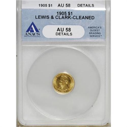 <B>1905 G$1 Lewis and Clark--Cleaned--ANACS. AU58 Details.</B></I> The fields are slightly bright, and careful rotation yields delicate hairlines, but this well struck example displays abundant luster.<BR><BR><b>Shipping:</b> Coins & Currency (<a target="_blank" href="http://www.heritageauctions.com/common/shipping.php">view shipping information</a>)