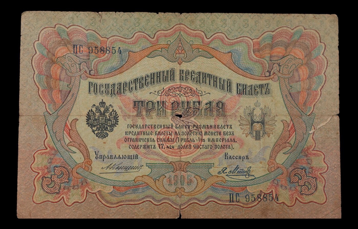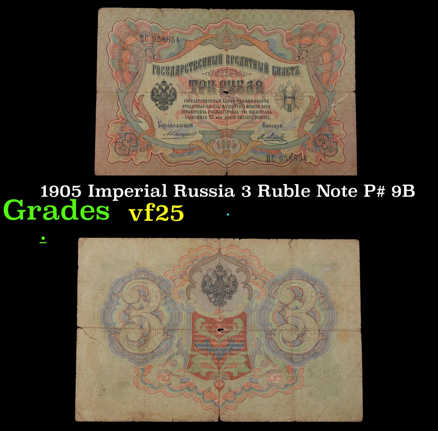 1905 Imperial Russia 3 Ruble Note P# 9B Grades vf+.