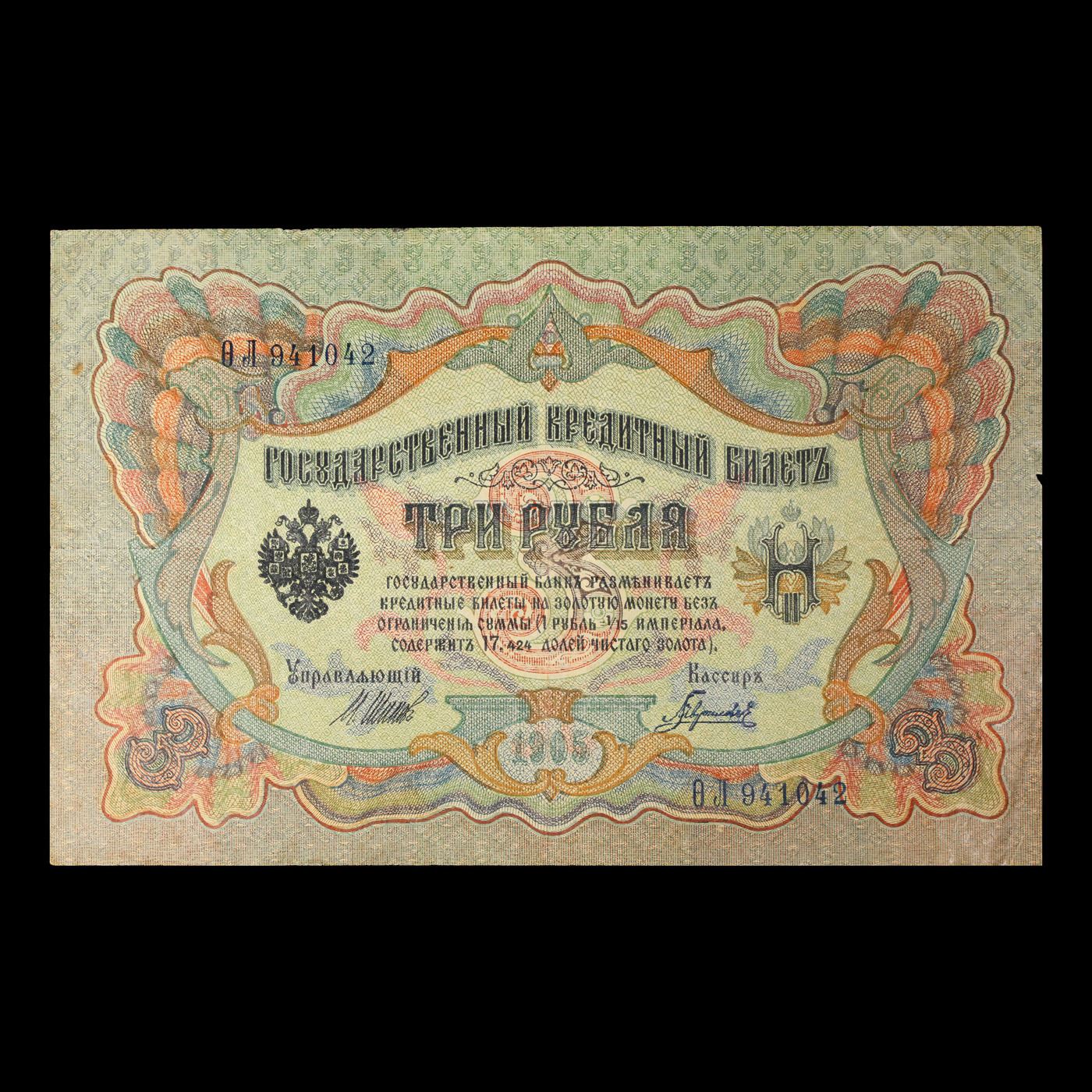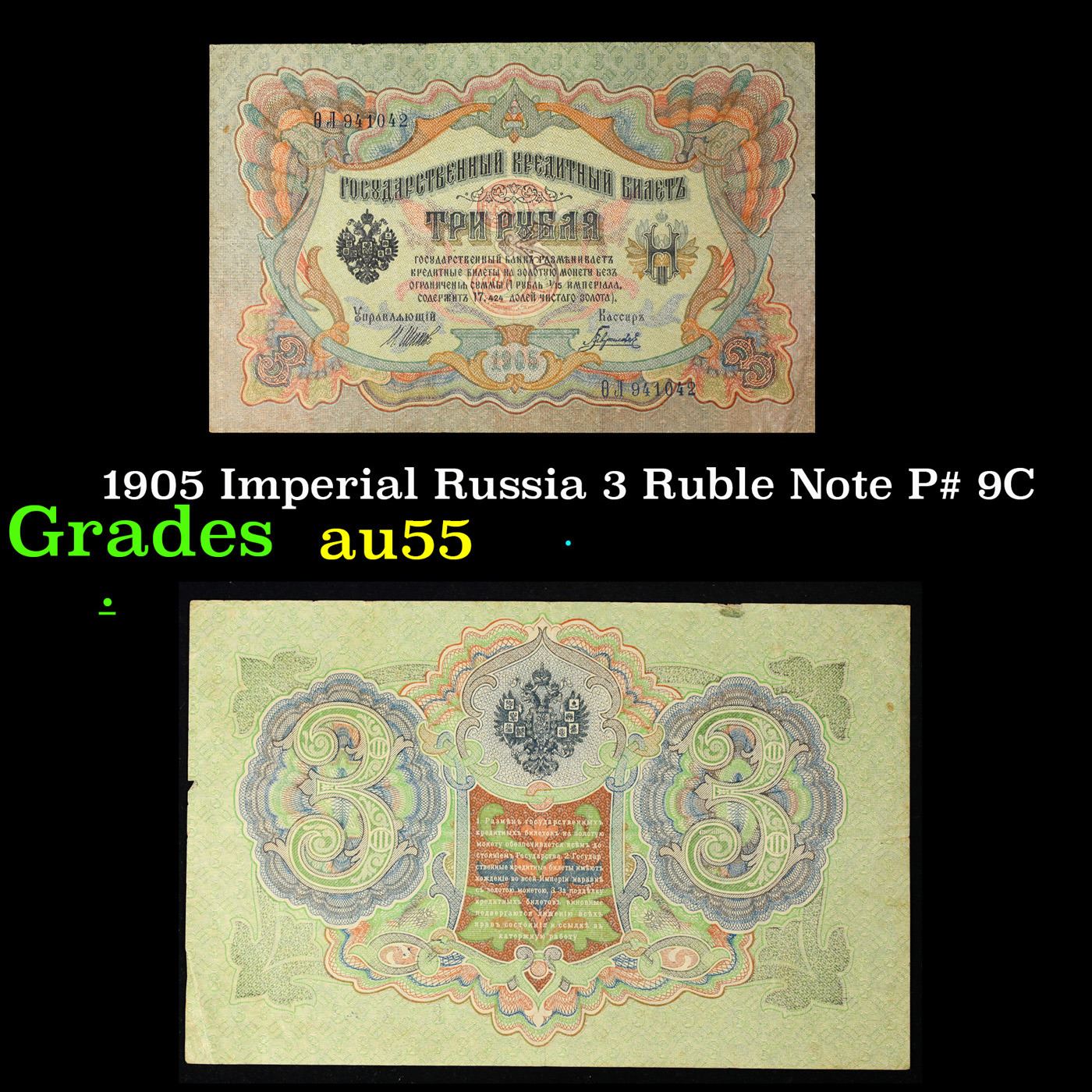 1905 Imperial Russia 3 Ruble Note P# 9C Grades Choice AU.