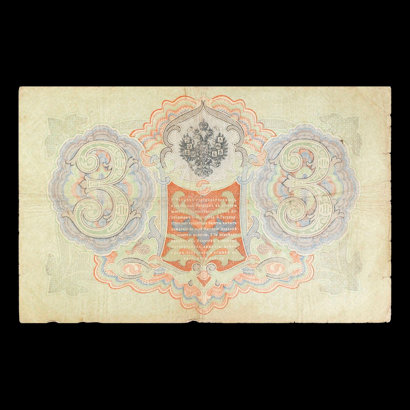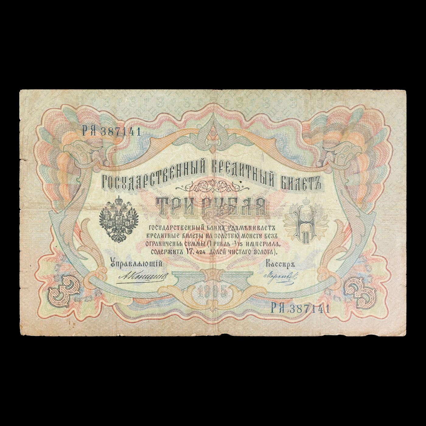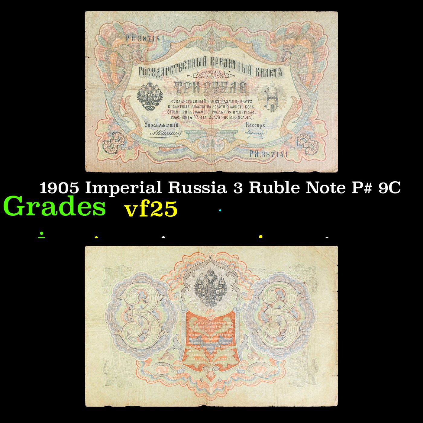 1905 Imperial Russia 3 Ruble Note P# 9C Grades vf+.