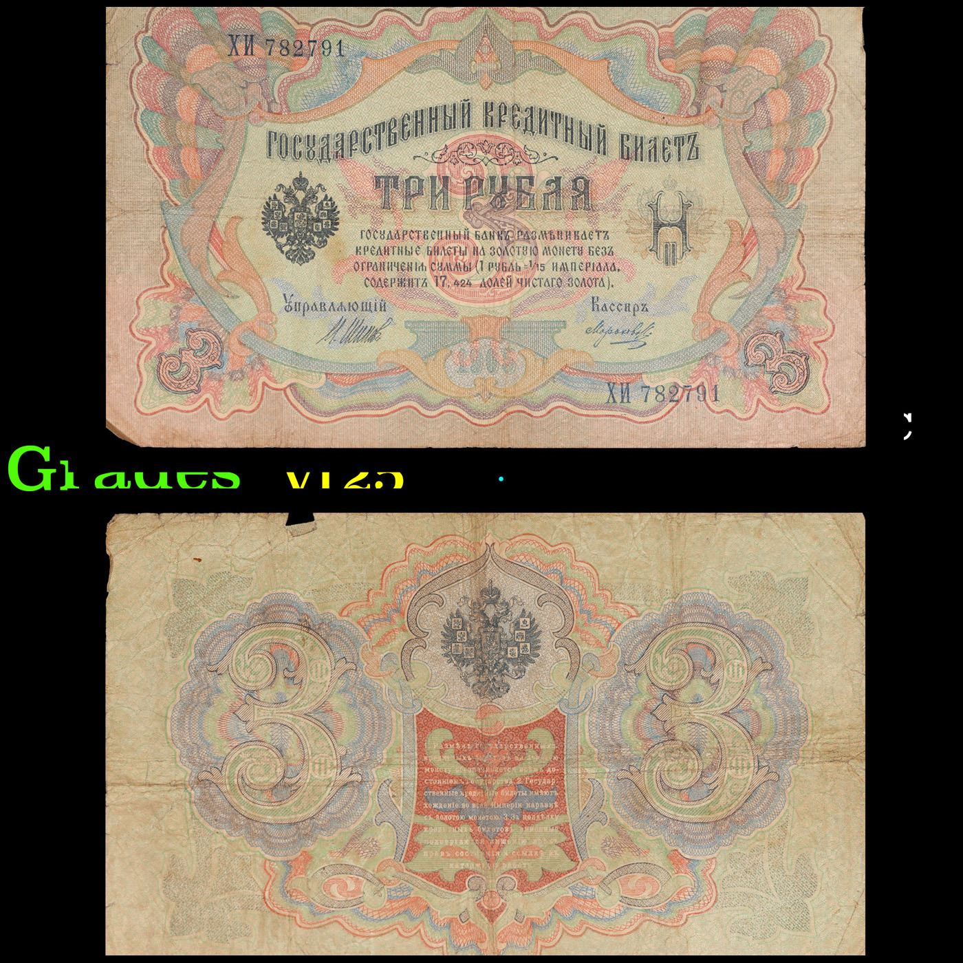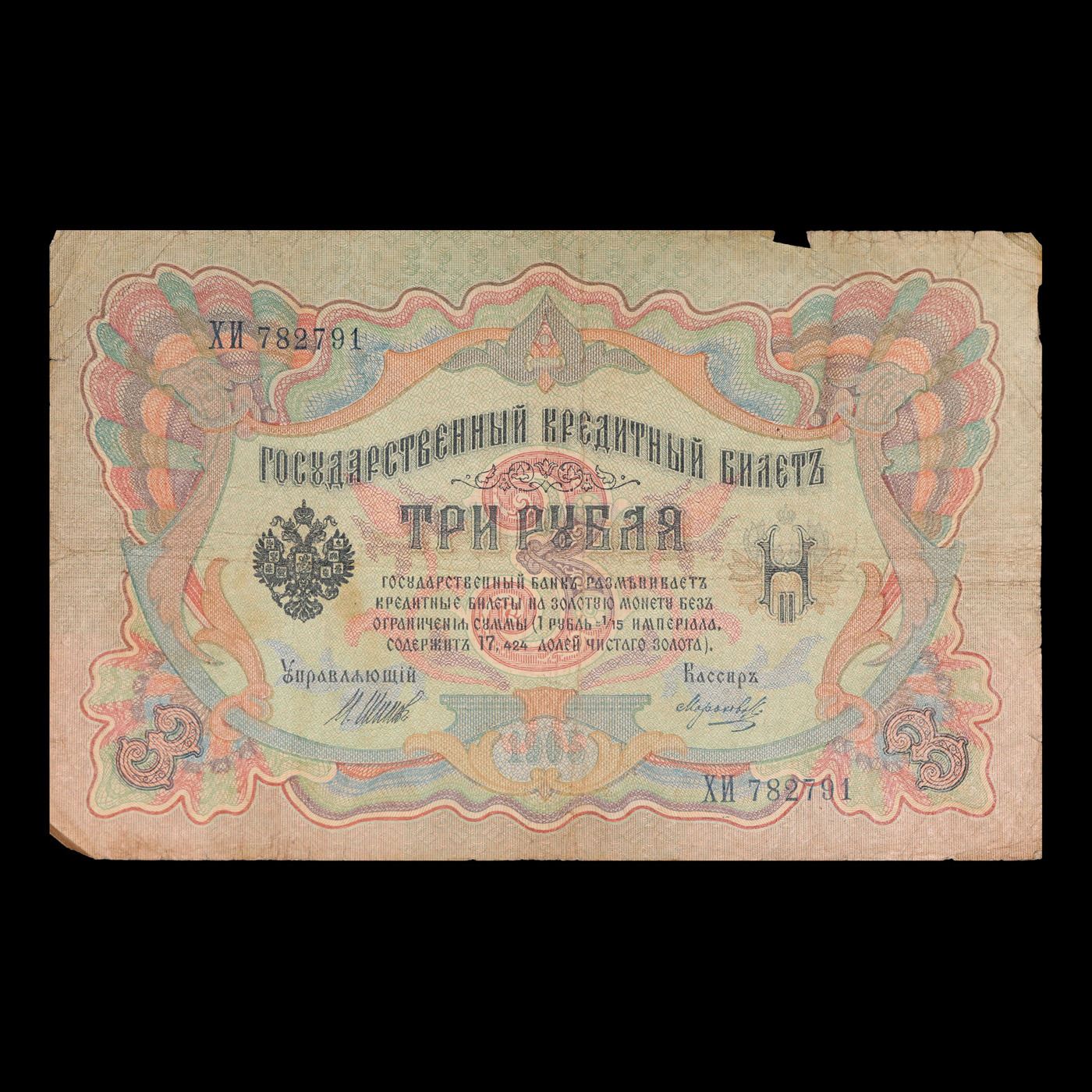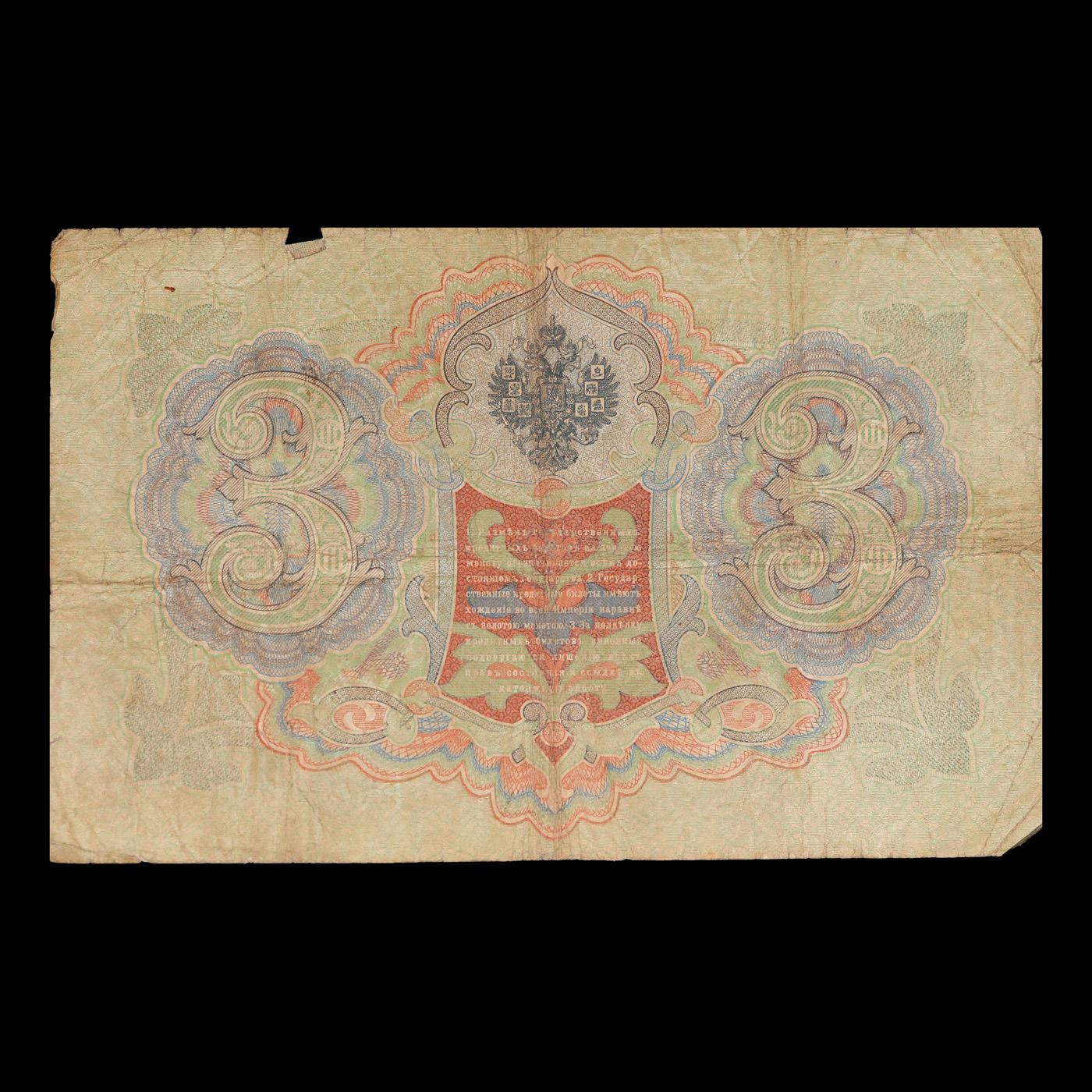 1905 Imperial Russia 3 Ruble Note P# 9C Grades vf+. Up for auction we have a beautiful, ornate Imperial Ruble note from the final decade of the Russian Empire under Tsar Nicholas II, which managed to survive through the Russian Revolution and Civil War. These notes became relatively useless in the early Soviet period, due to hyperinflation and other factors, and many were lost or destroyed.