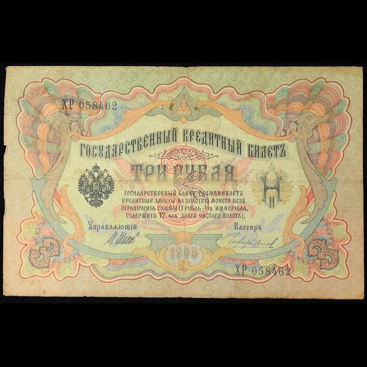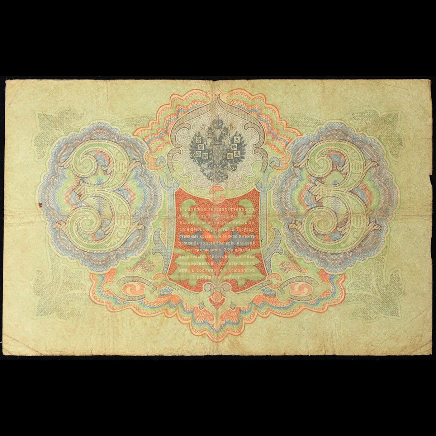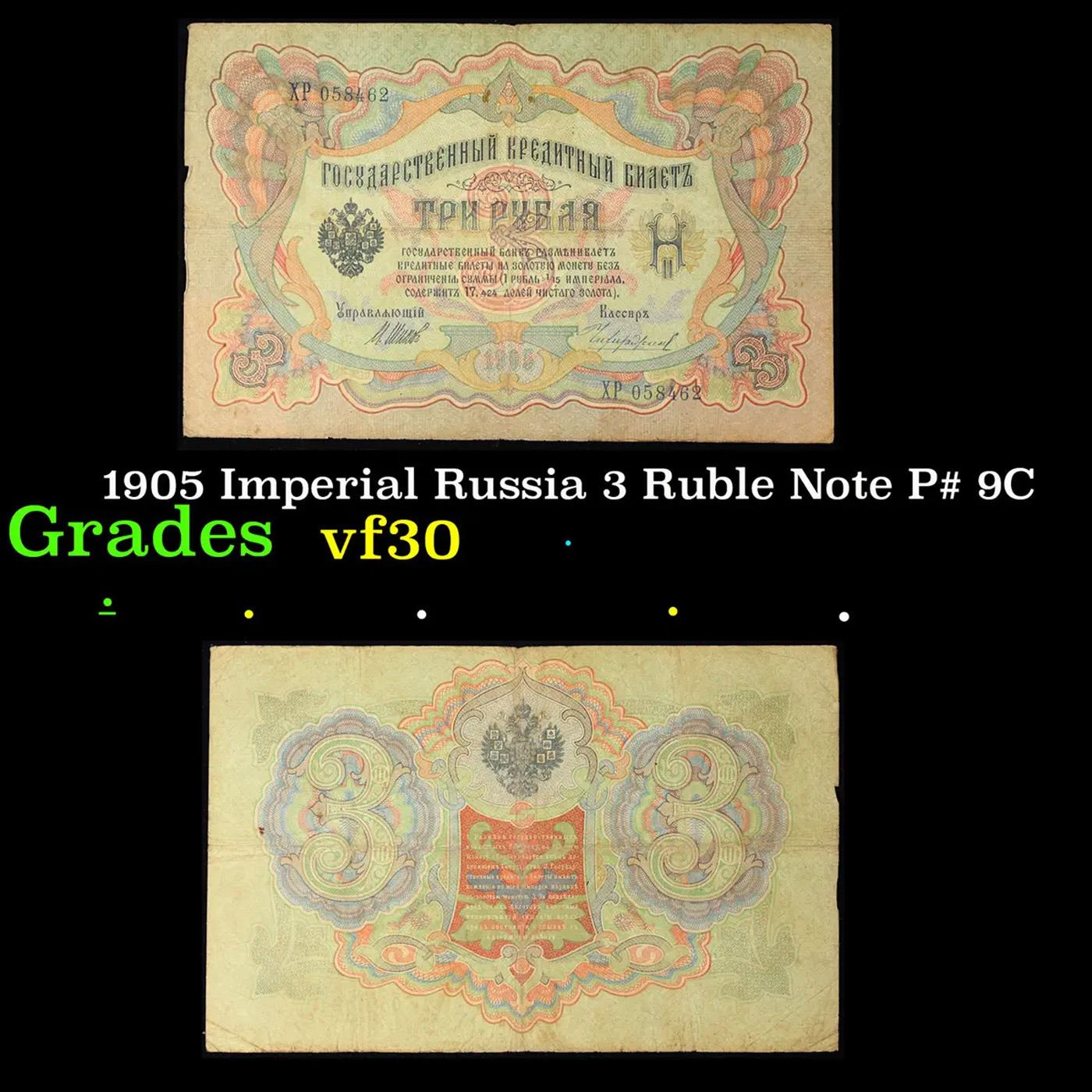 1905 Imperial Russia 3 Ruble Note P# 9C Grades vf++.