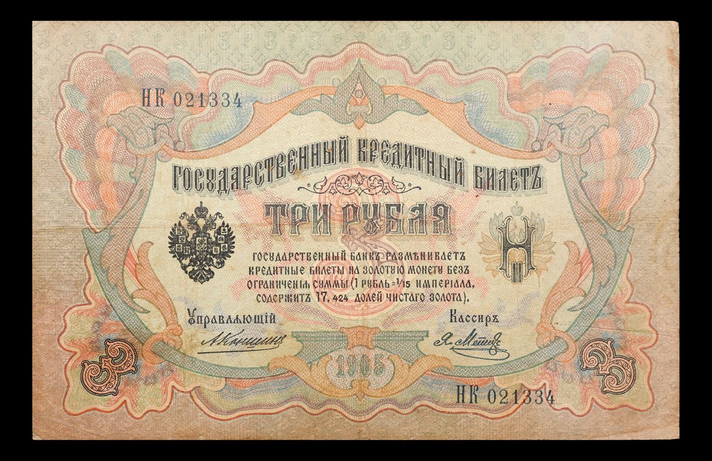 1905 Imperial Russia 3 Ruble Note P# 9c Grades vf+. Up for auction we have a beautiful, ornate Imperial Ruble note from the final decade of the Russian Empire under Tsar Nicholas II, which managed to survive through the Russian Revolution and Civil War. These notes became relatively useless in the early Soviet period, due to hyperinflation and other factors, and many were lost or destroyed.