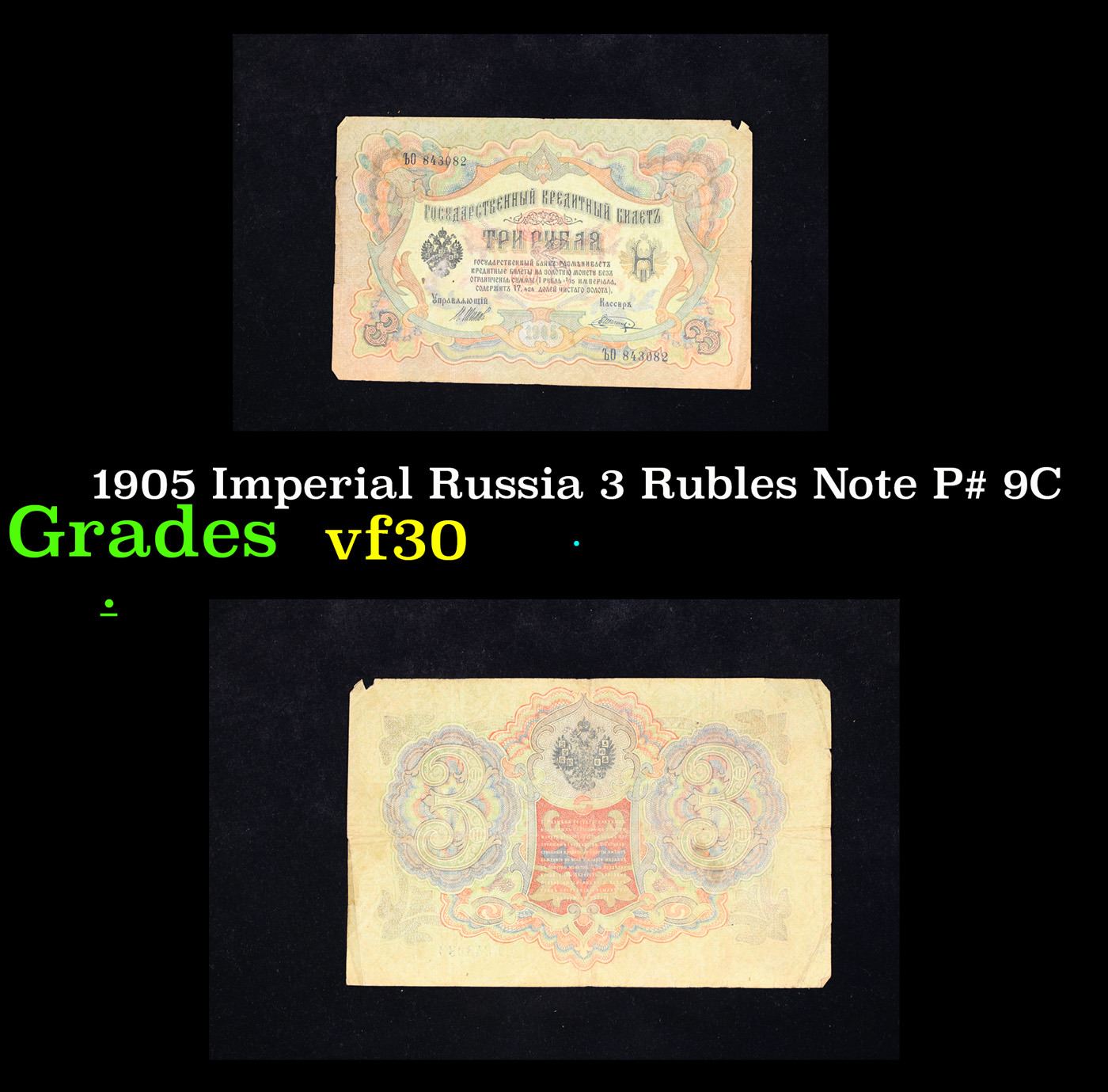 1905 Imperial Russia 3 Rubles Note P# 9C Grades vf++. Up for auction we have a beautiful, ornate Imperial Ruble note from the final decade of the Russian Empire under Tsar Nicholas II, which managed to survive through the Russian Revolution and Civil War. These notes became relatively useless in the early Soviet period, due to hyperinflation and other factors, and many were lost or destroyed.