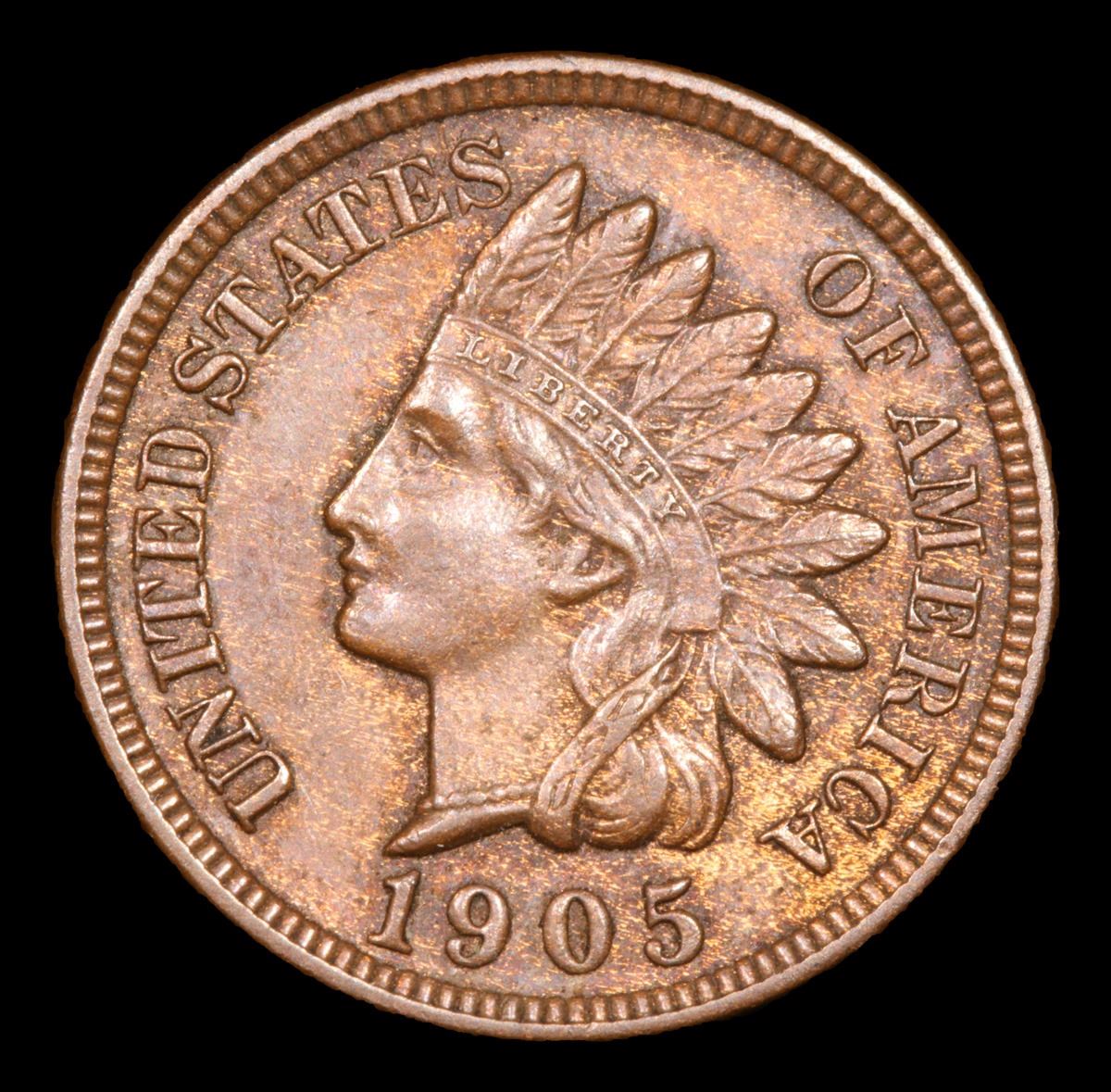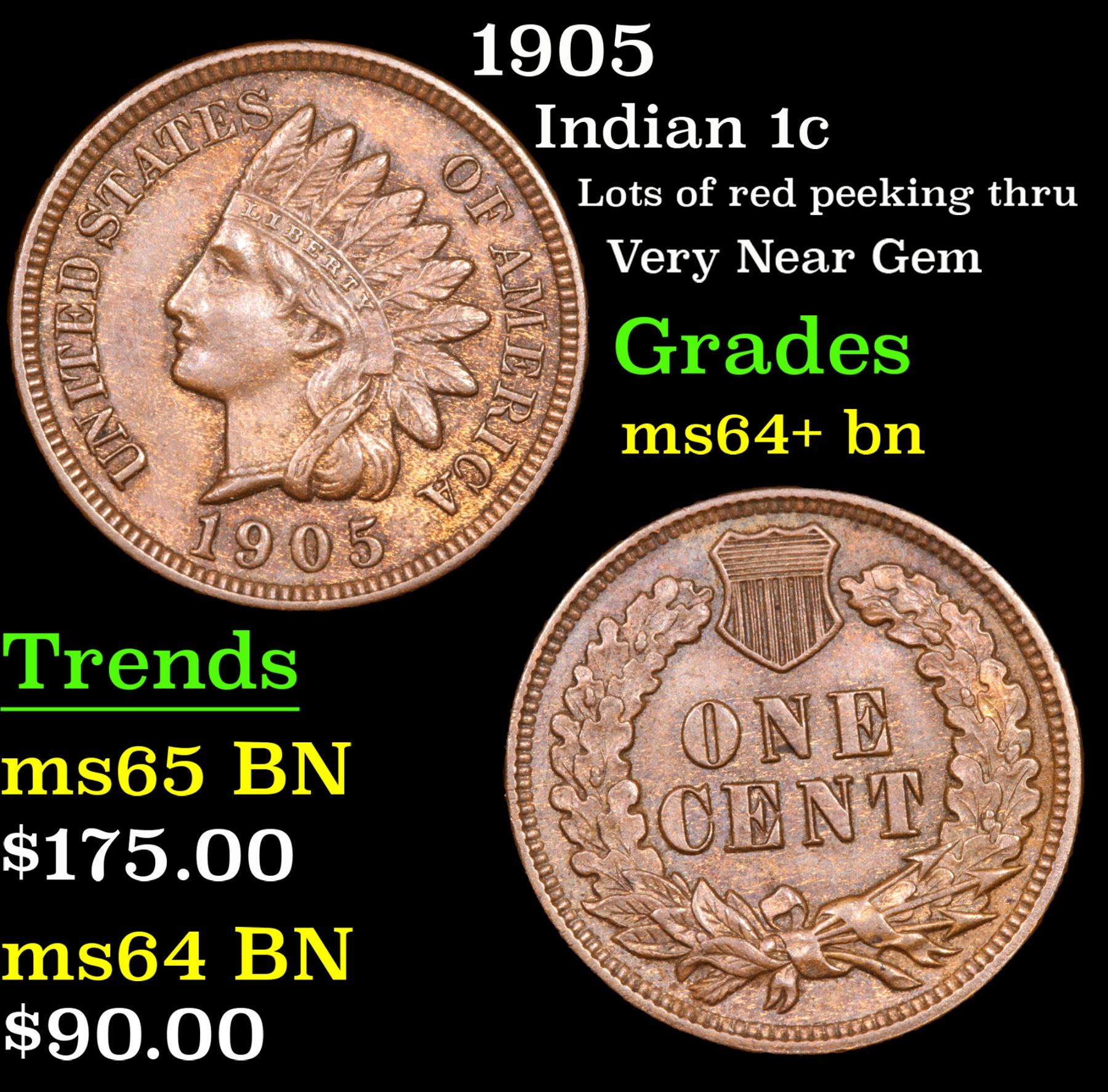 1905 Lots of red peeking thru Very Near Gem Indian Cent 1c Grades Choice+ Unc BN.