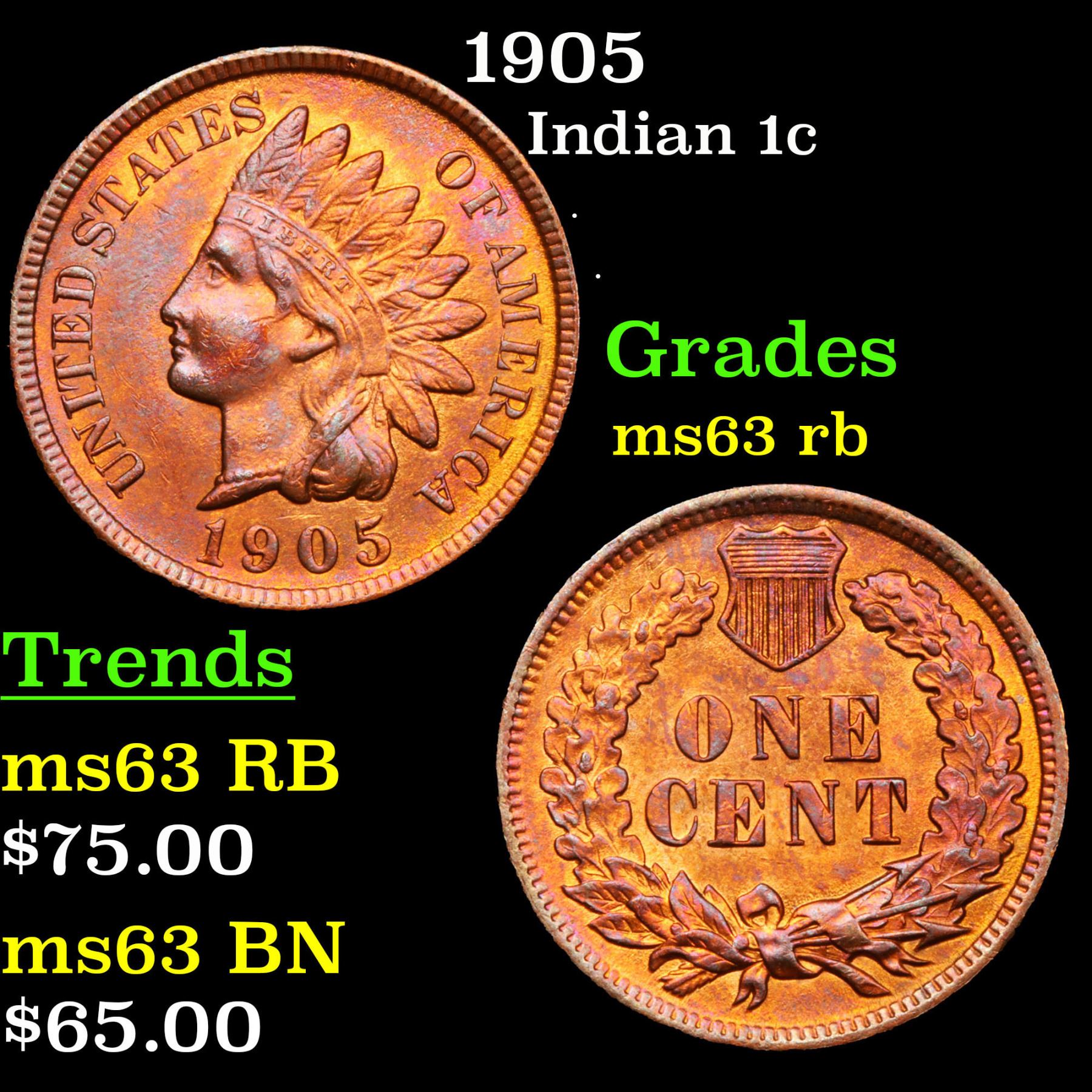 1905 Indian Cent 1c Grades Select Unc RB.