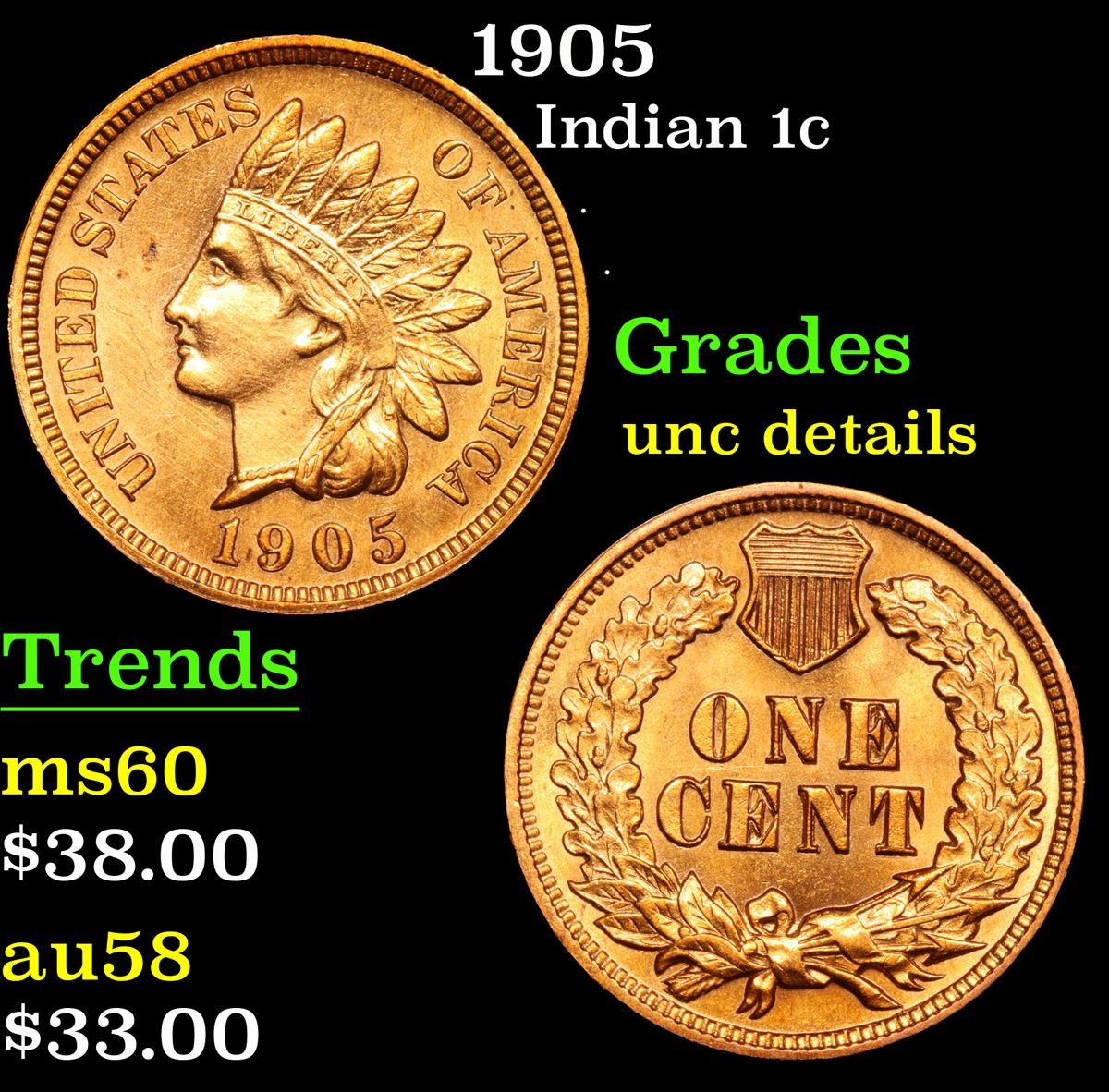 1905 Indian Cent 1c Grades Unc details.