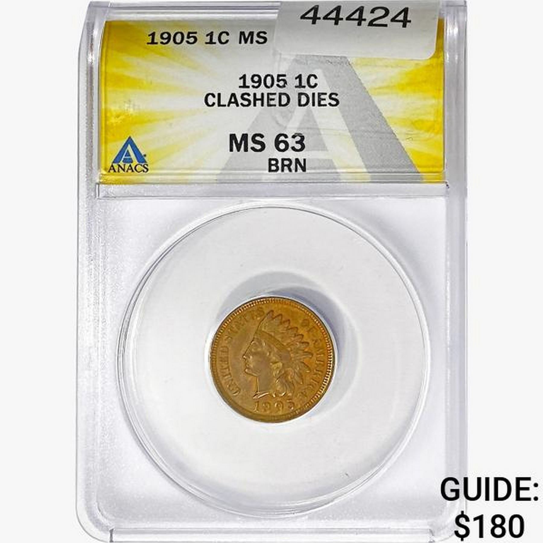 1905 Indian Head Cent ANACS MS63 CLASHED DIES BRN