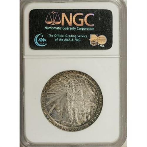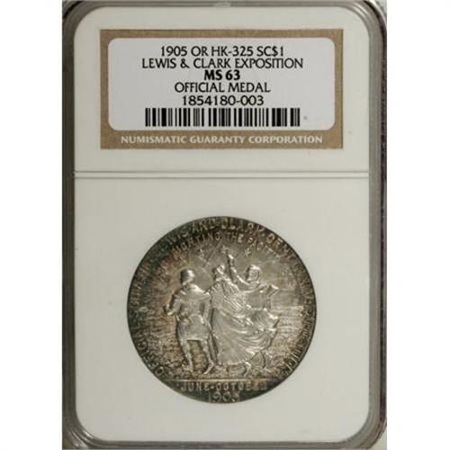 <B>1905 Lewis & Clark Centennial, HK-325, MS63 NGC.</B></I> Silver, 34.9 mm, "rare" (HK, 1963). Iridescent amber-gold and blue-green patina encircles the rims on both sides of this pretty Select piece.<BR><BR><b>Shipping:</b> Coins & Currency (<a target="_blank" href="http://www.heritageauctions.com/common/shipping.php">view shipping information</a>)