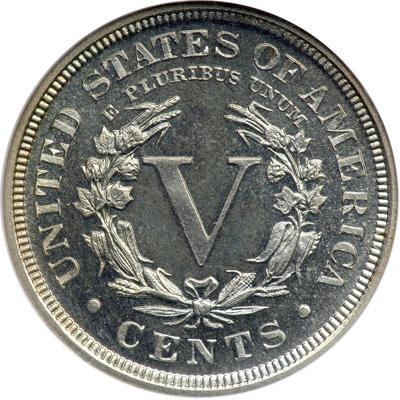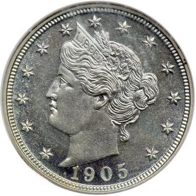 1905 Liberty Nickel. NGC graded Proof 67. A splendid brilliant Proof example with hints of pastel toning. A total of 2,152 Proofs were struck. This highly lustrous and largely brilliant "V" nickel displays full Proof mirrors on both sides. Razor-sharp and "as struck," with just outstanding detail in the stars and waves of hair, along with all the fine detail showing in the wreath. Superb! Pop 21; 2 better in 68.