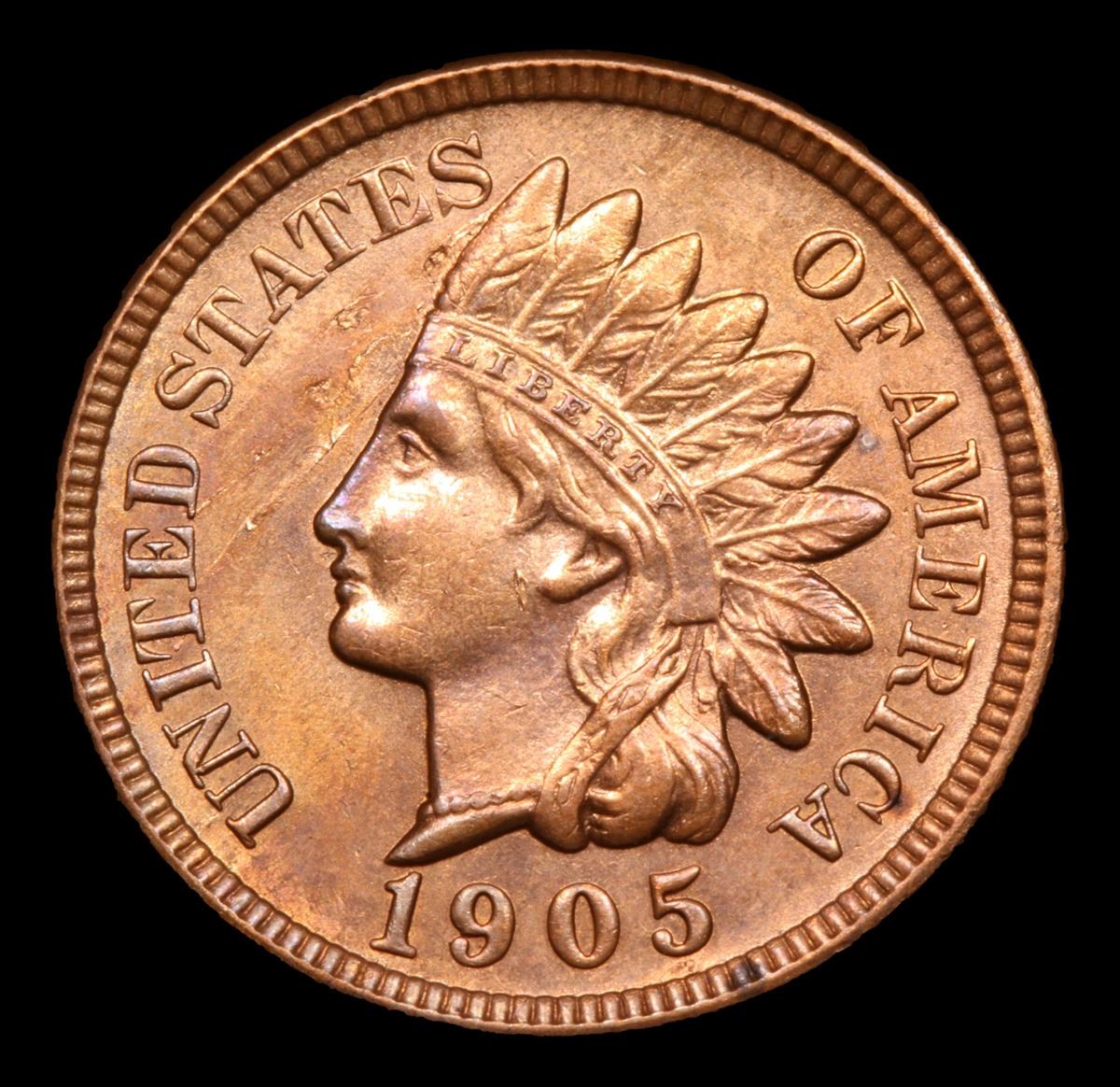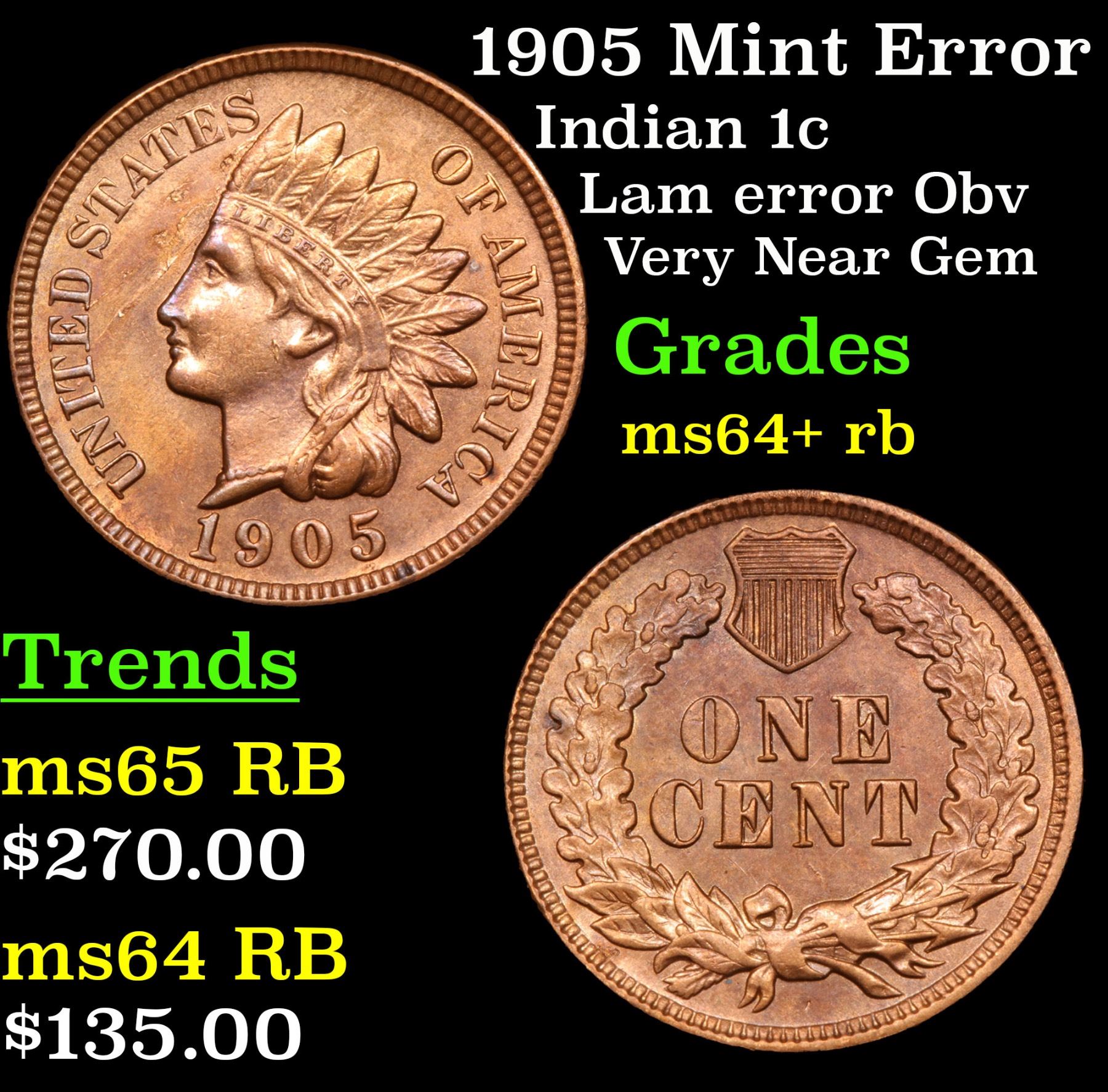 1905 Mint Error Lam error Obv Very Near Gem Indian Cent 1c Grades Choice+ Unc RB.
