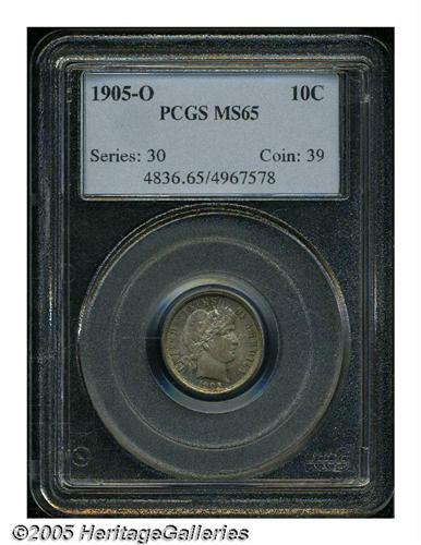 <B>1905-O<10C> MS65 PCGS.</B></I> Mottled violet and gold, with deep blue scattered across the reverse. Matte-like luster, a tiny disturbance is seen on Liberty's cheek.