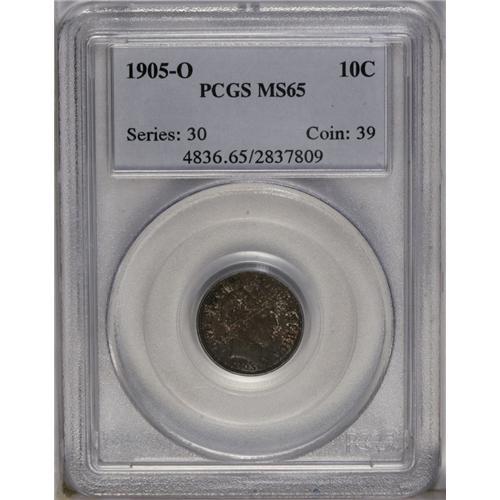 <B>1905-O<10C> MS65 PCGS.</B></I> A sharply struck and lustrous Gem example of this scarce date, with orange and avocado toning overlaid on dove-gray patina laced with electric blue. Light marks restrict the grade.
