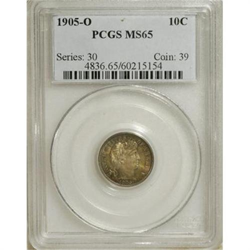 <B>1905-O 10C MS65 PCGS.</B></I> Elegant olive and silver-blue shadings bathe each side of this captivating Gem. Pleasingly detailed for this later O-mint issue with excellent eye appeal. Population: 16 in 65, 27 finer (3/08).<BR><BR><B>Coin Engraver:</B> Charles E. Barber<BR><BR><b>Shipping:</b> Coins & Currency (<a target="_blank" href="http://www.heritageauctions.com/common/shipping.php">view shipping information</a>)