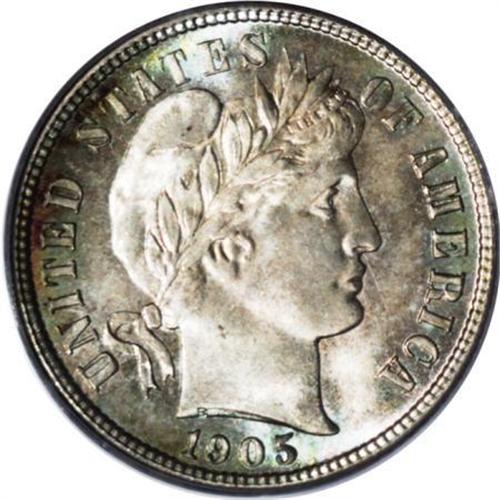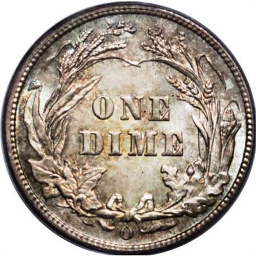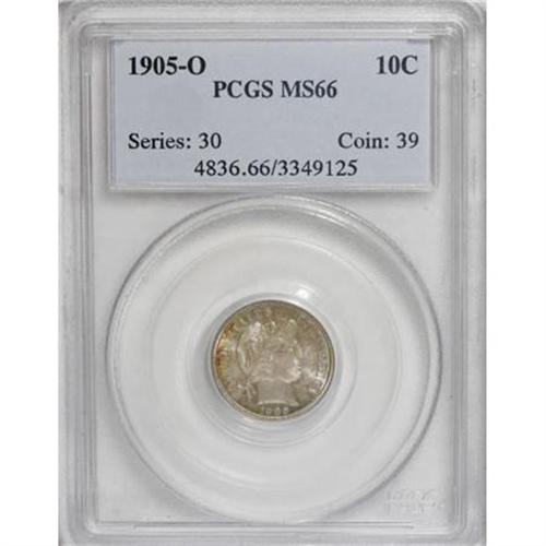 <B>1905-O 10C MS66 PCGS.</B></I> Original tan-gold, dove-gray, and light blue-green adorn this decisively struck Premium Gem. Cartwheel luster bathes the essentially unabraded surfaces. A good candidate for a high quality New Orleans type set. Population: 17 in 66, 5 finer (4/07).<BR><I>From The Belle Glade Collection, Part Two.</B></I><BR><BR><B>Coin Engraver:</B> Charles E. Barber<BR><BR><b>Shipping:</b> Coins & Currency (<a target="_blank" href="http://www.heritageauctions.com/common/shipping.php">view shipping information</a>\)