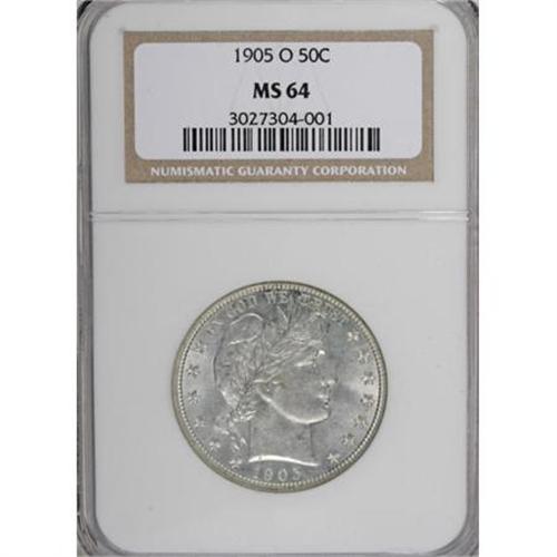 <B>1905-O 50C MS64 NGC.</B></I> A lovely survivor from the issue that has the second-lowest mintage across New Orleans Barber halves, with just 505,000 pieces struck. Hints of silver-gray patina visit the well-preserved, softly lustrous obverse and the more flashy reverse. Solidly struck with excellent eye appeal for the grade. Census: 20 in 64, 13 finer (10/07).<BR><BR><B>Coin Engraver:</B> Charles E. Barber<BR><BR><b>Shipping:</b> Coins & Currency (<a target="_blank" href="http://www.heritageauctions.com/common/shipping.php">view shipping information</a>)
