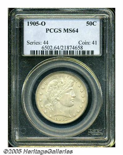 <B>1905-O<50C> MS64 PCGS.</B></I> The 1905-O is perhaps a bit more available than the mintage of 505,000 pieces would indicate. Nevertheless, it is a still a challenging issue in mint condition. Well struck for an O-mint half, the satiny surfaces show even, light gray toning over each side.