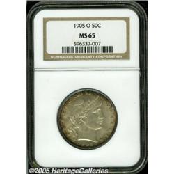 <B>1905-O 50C MS65 NGC.</B></I> Like most O-mint issues in this series, the 1905-O is usually found in well worn condition. Mint State survivors, when they are available, are apt to grade no finer than MS63. It is little wonder, therefore, that we take pride in the offering of this richly toned Gem. Deep golden-russet and cobalt-blue is seen at the obverse border, some pale golden color circles the reverse. The strike is relatively bold for an O-mint issue, and there are no distracting abrasions. Population: 5 in 65, 7 finer (2/05).