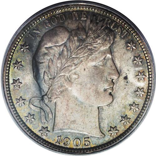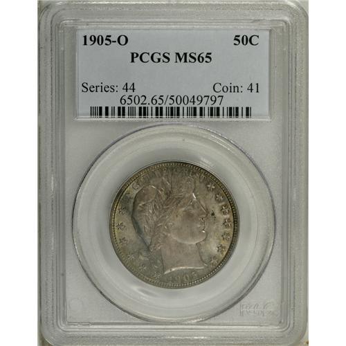 <B>1905-O 50C MS65 PCGS.</B></I> A fine representative of this often-difficult New Orleans Barber half. The strike has very little evidence of that Mint's standard softness, and both sides are coated in light gray, gold, and mint-green toning that deepens on the reverse. Minor spotting is noted in the field before Liberty's nose. Population: 10 in 65, 8 finer (12/06).<BR><BR><b>Shipping:</b> Coin/Currency (<a target="_blank" href="http://www.heritageauctions.com/common/shipping.php">view shipping information</a>)
