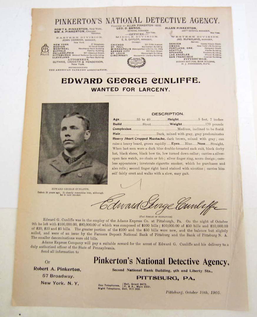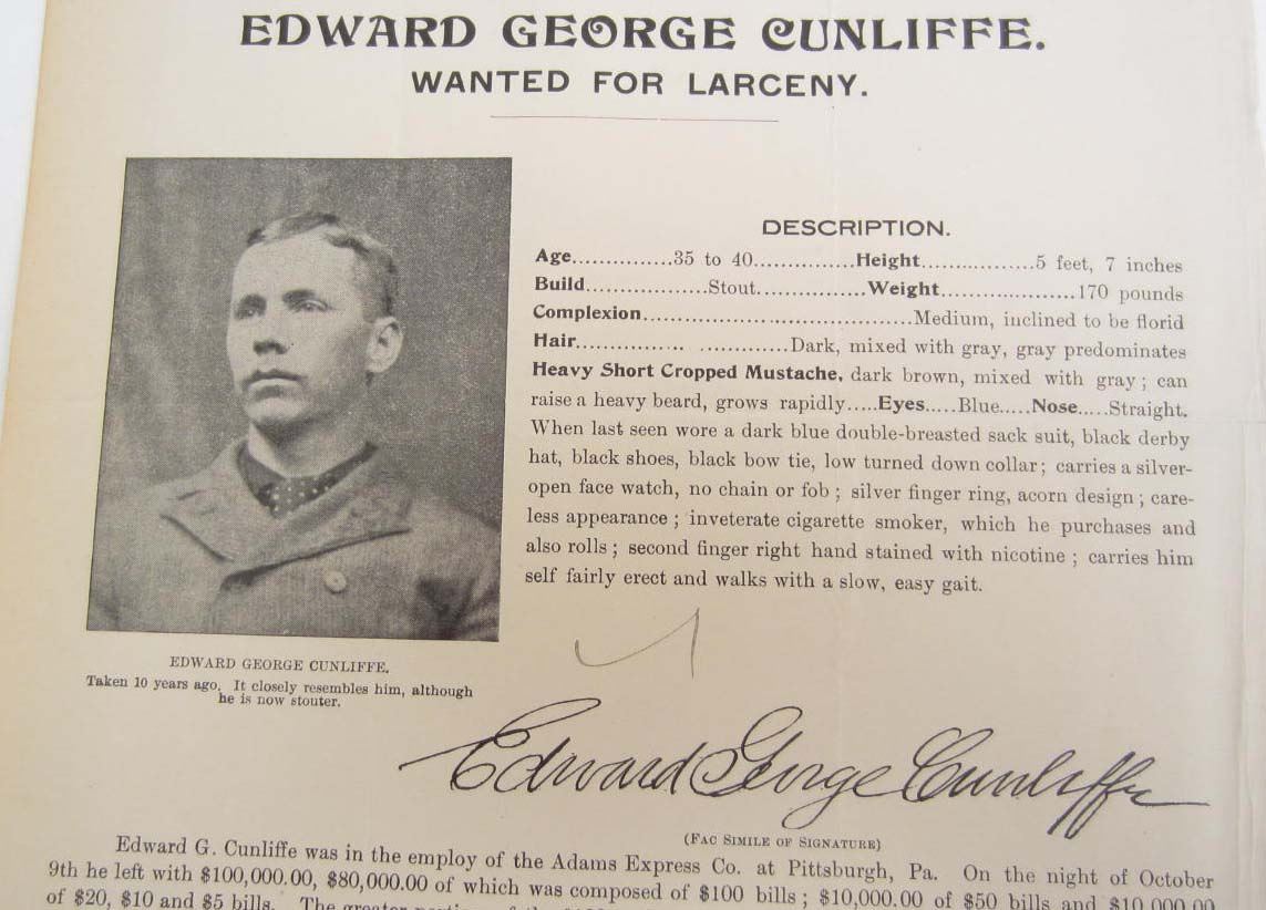 Edward G. Cunliffe - He stole $100,000.00 from Adams Express Co. - Approx. 8.5" x 12"