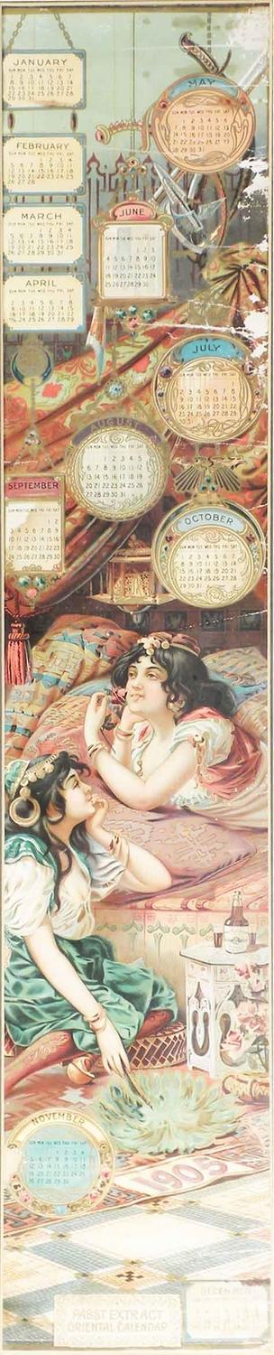1905 Pabst Extract Oriental Calendar. Metal band at top. Framed under glass. Missing cardboard tube at bottom, creases and paper loss along sides, fair condition. 7 X 36 inches image only.