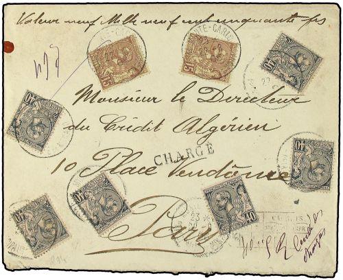 1905 Registered and charged envelope to FRANCE bearing Monaco 40 cent grey on rose (6) (Yvert 17) and 15 cent pale brown (2) (Yvert 24) tied by MONTE CARLO datestamp with handstruck CHARGE and boxed accountancy with PARIS arrival on reverse. Superb.