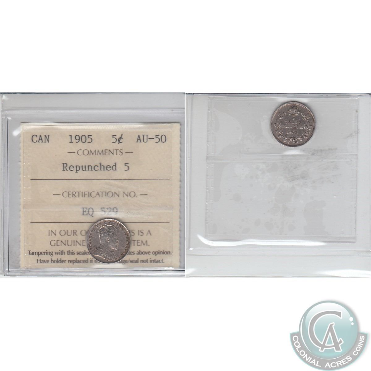 1905 Repunched 5 Canada 5-cent ICCS Certified AU-50