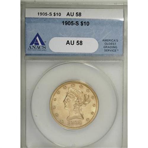 <B>1905-S $10 AU58 ANACS.</B></I> . NGC Census: (206/123). PCGS Population (64/69). Mintage: 369,250. Numismedia Wsl. Price for NGC/PCGS coin in AU58: $446. (#8758)<BR><BR><B>Coin Engraver:</B> Christian Gobrecht<BR><BR><b>Shipping:</b> Coins & Currency (<a target="_blank" href="http://www.heritageauctions.com/common/shipping.php">view shipping information</a>)