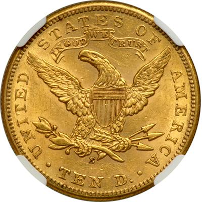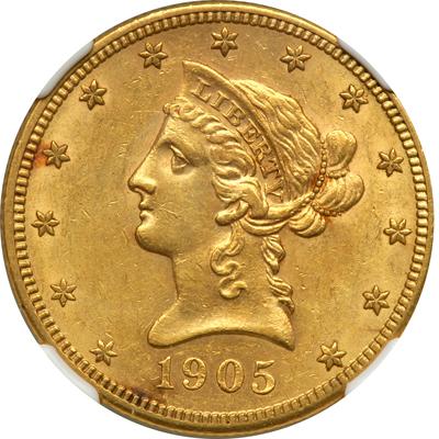 1905-S $10 Liberty. NGC graded AU-58. Close to 75% luster remains (PCGS # 8758).
