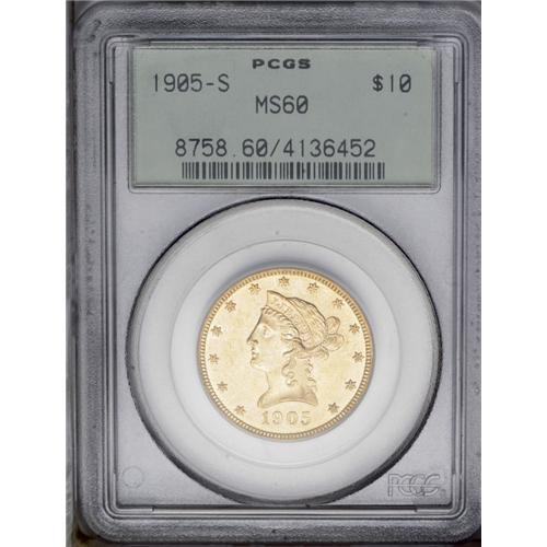 <B>1905-S<$10> MS60 PCGS.</B></I> A well struck example with fewer marks than customary for the MS60 grade. The '05-S is a highly regarded conditional scarcity. Housed in a green label holder. Population: 11 in 60, 51 finer (4/06).