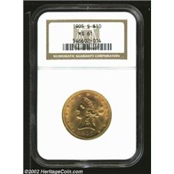 1905-S $10 MS61 NGC. Lustrous with a few abrasions scattered about. Important notice: We expect to be auctioning lots at the rate of 200-250 per hour. Sometimes eBay Premier live bid software cannot keep up with that pace, so we strongly recommend that you place a realistic proxy bid now as insurance to avoid disappointment. Also please note that all Heritage/CAA lots purchased through eBay Premier carry a 20% Buyer's Premium. Please make sure you read the Terms and Conditions.