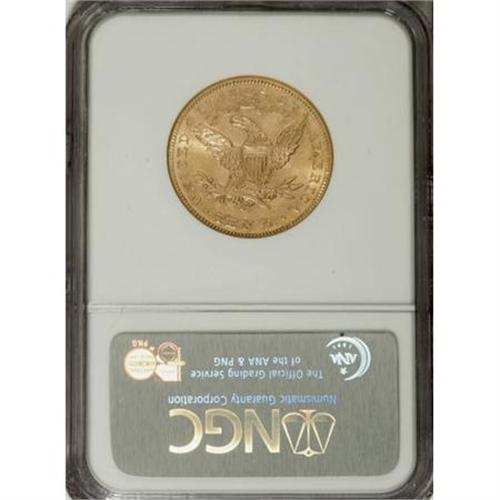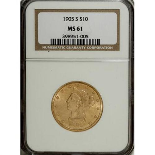 <B>1905-S $10 MS61 NGC.</B></I> Satin luster is unbroken by the various tiny marks that correspond to the grade. Traditionally, the most difficult 20th-century issue of the type to locate in Mint State, although the 1900-S (if it is considered 20th-century) is also challenging. Census: 57 in 61, 22 finer (7/07).<BR><BR><B>Coin Engraver:</B> Christian Gobrecht<BR><BR><b>Shipping:</b> Coins & Currency (<a target="_blank" href="http://www.heritageauctions.com/common/shipping.php">view shipping information</a>)