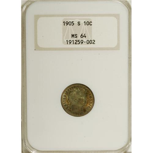 <B>1905-S 10C MS64 NGC.</B></I> NGC Census: (24/15). PCGS Population (46/25). Mintage: 6,855,199. Numismedia Wsl. Price: $440. (#4837)<BR><BR><b>Shipping:</b> Coins & Currency (<a target="_blank" href="http://www.heritageauctions.com/common/shipping.php">view shipping information</a>)