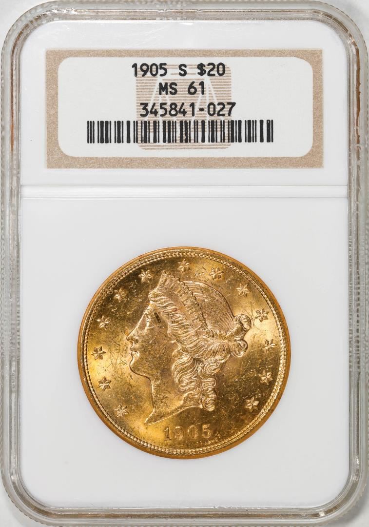 One 1905-S $20 Liberty Head Eagle Gold Coin NGC MS61. NGC Certified.