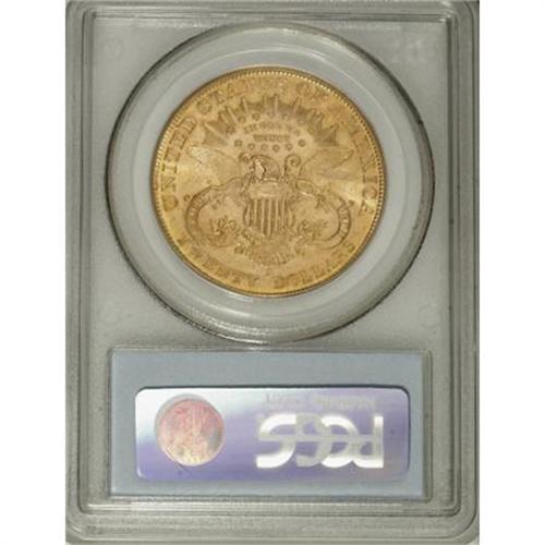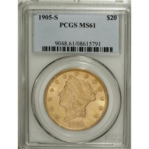 <B>1905-S $20 MS61 PCGS.</B></I> Some prooflike characteristics are noted on this peach-gold specimen, particularly on the reverse. All of the design elements benefited from a well executed strike, as evidenced from the detail in Liberty's hair strands and the eagle's plumage. A few small contact marks limit the grade.<BR><BR><B>Coin Engraver:</B> James B. Longacre<BR><BR><b>Shipping:</b> Coins & Currency (<a target="_blank" href="http://www.heritageauctions.com/common/shipping.php">view shipping information</a>)