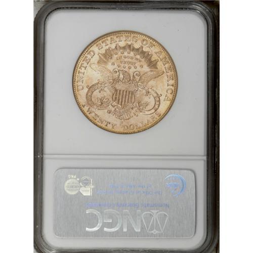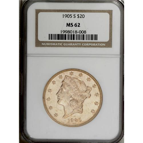 1905-S $20 MS62 NGC. Highly lustrous with a bit of fla