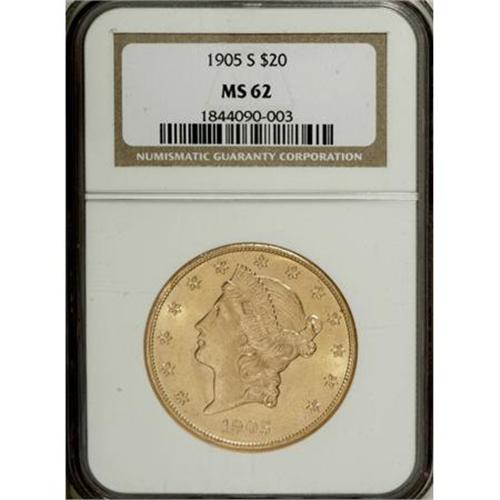 <B>1905-S $20 MS62 NGC.</B></I> NGC Census: (589/399). PCGS Population (566/533). Mintage: 1,813,000. Numismedia Wsl. Price for NGC/PCGS coin in MS62: $745. (#9048)<BR><BR><b>Shipping:</b> Coins & Currency (<a target="_blank" href="http://www.heritageauctions.com/common/shipping.php">view shipping information</a>)