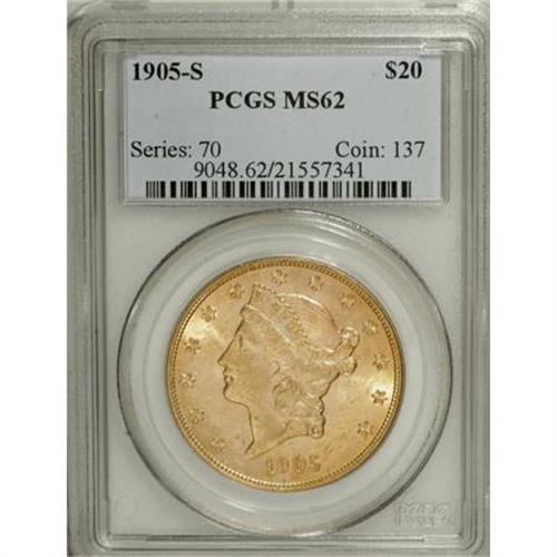 <B>1905-S $20 MS62 PCGS.</B></I> PCGS Population (566/533). NGC Census: (589/399). Mintage: 1,813,000. Numismedia Wsl. Price for NGC/PCGS coin in MS62: $755. (#9048)<BR><BR><B>Coin Engraver:</B> James B. Longacre<BR><BR><b>Shipping:</b> Coins & Currency (<a target="_blank" href="http://www.heritageauctions.com/common/shipping.php">view shipping information</a>\)