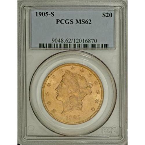 <B>1905-S $20 MS62 PCGS.</B></I> Vibrant yellow-gold with occasional orange and mint-green shadings. The luster is excellent, the strike is solid, and this S-mint double eagle offers good overall eye appeal.<BR><I>From The York/Hallenbeck #2 Current Finest PCGS Registry Set of Liberty Double Eagles.</B></I><BR><BR><B>Coin Engraver:</B> James B. Longacre<BR><BR><b>Shipping:</b> Coins & Currency (<a target="_blank" href="http://www.heritageauctions.com/common/shipping.php">view shipping information</a>)